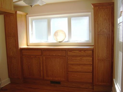 Quality Cabinets at an Affordable Price. Julie Zoet, Dining Room Cabinet.Custom built to fit space and her wishes for storage space.![]() ![]() Oak with Golden Oak Stain. Flat panel doors. Blum undermount drawer slides. Custom built oak countertop, furniture grade. |