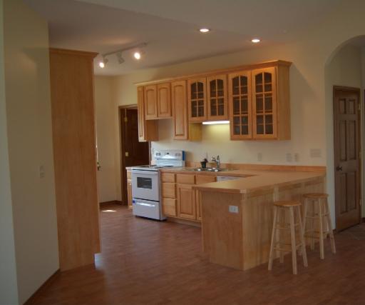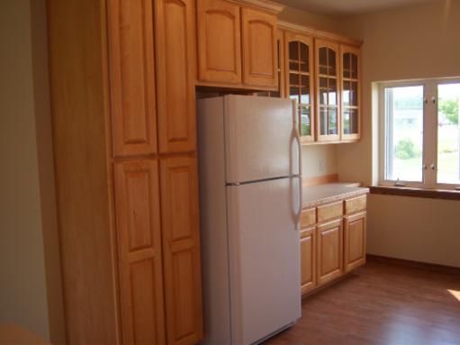 Maple cabinets, natural stain. Custom made glass doors.Roll out shelves in pantry and base cabinets.