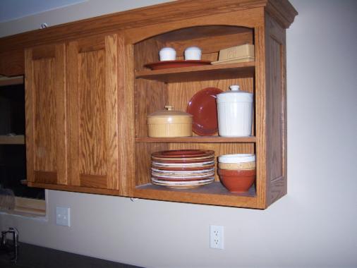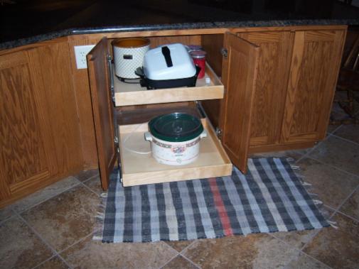 Angled Upper Corner Cabinet - easier to reach, Holds more than lazy susan corner cabinet. Shelves are adjustable. Door can swing either way.