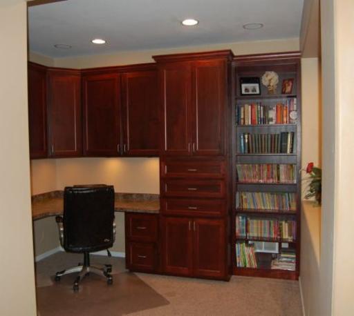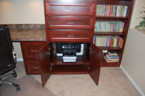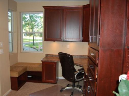 Quality Cabinets at an Affordable Price. Office cabinets for home or business.Cabinets in this office are Soft Maple stained cherry.Book shelf, file drawers. 3 wide drawers hold drawings for homes. A couple benches to use up the corner. Fax machine on a roll-out shelf. |